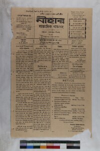 A weekly journal, “Nihar”, used to be published from Knathi, Midnapore in West Bengal, India. It contains writings on the National Movement. It was a special example of regional newspapers and how they have seen our national movement. Not only national movements or issues, this journal has been created a landmark of continuity. Custodial history: Nihar belonged to the Nihar Press established by Madhusudan Jana and at present his grandson Mr. Nitindranath Jana is the sole owner of the newspaper. The newspapers are located in the ancestral house of Nitindranath Jana from where Nihar used to run till 1989. Administrative context: The CSSSC, on realising the importance of copying the collection applied for a grant to the EAP against which EAP921 has been awarded. Calendar: Common Calendar. Extent and format of original material: Weekly printed news paper. Physical characteristics: Brittle, old newsprint in poor condition. The original volume with length of 35 cm. Volume and issue number: Vol.-74; Issue-15. Owner(s) of original material: Mr. Nitindranath Jana. Publisher of original material: Midnapur: J. N. Jana, Nihar Press. Editor of original material: Jatindranath Jana.