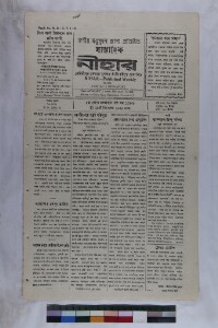 A weekly journal, “Nihar”, used to be published from Knathi, Midnapore in West Bengal, India. It contains writings on the National Movement. It was a special example of regional newspapers and how they have seen our national movement. Not only national movements or issues, this journal has been created a landmark of continuity. Custodial history: Nihar belonged to the Nihar Press established by Madhusudan Jana and at present his grandson Mr. Nitindranath Jana is the sole owner of the newspaper. The newspapers are located in the ancestral house of Nitindranath Jana from where Nihar used to run till 1989. Administrative context: The CSSSC, on realising the importance of copying the collection applied for a grant to the EAP against which EAP921 has been awarded. Calendar: Common Calendar. Extent and format of original material: Weekly printed news paper. Physical characteristics: Brittle, old newsprint in poor condition. The original volume with length of 35 cm. Volume and issue number: Vol.-79; Issue-16. Owner(s) of original material: Mr. Nitindranath Jana. Publisher of original material: Midnapur: J. N. Jana, Nihar Press. Editor of original material: Jatindranath Jana.