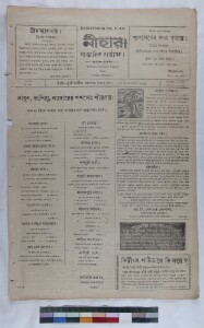A weekly journal, “Nihar”, used to be published from Knathi, Midnapore in West Bengal, India. It contains writings on the National Movement. It was a special example of regional newspapers and how they have seen our national movement. Not only national movements or issues, this journal has been created a landmark of continuity. Custodial history: Nihar belonged to the Nihar Press established by Madhusudan Jana and at present his grandson Mr. Nitindranath Jana is the sole owner of the newspaper. The newspapers are located in the ancestral house of Nitindranath Jana from where Nihar used to run till 1989. Administrative context: The CSSSC, on realising the importance of copying the collection applied for a grant to the EAP against which EAP921 has been awarded. Calendar: Common Calendar. Extent and format of original material: Weekly printed news paper. Physical characteristics: Brittle, old newsprint in poor condition. The original volume with length of 35 cm. Volume and issue number: Vol.-14; Issue-12. Owner(s) of original material: Mr. Nitindranath Jana. Publisher of original material: Midnapur: M. S. Jana, Nihar Press. Editor of original material: Madhusudan Jana.