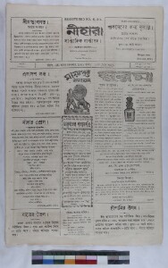 A weekly journal, “Nihar”, used to be published from Knathi, Midnapore in West Bengal, India. It contains writings on the National Movement. It was a special example of regional newspapers and how they have seen our national movement. Not only national movements or issues, this journal has been created a landmark of continuity. Custodial history: Nihar belonged to the Nihar Press established by Madhusudan Jana and at present his grandson Mr. Nitindranath Jana is the sole owner of the newspaper. The newspapers are located in the ancestral house of Nitindranath Jana from where Nihar used to run till 1989. Administrative context: The CSSSC, on realising the importance of copying the collection applied for a grant to the EAP against which EAP921 has been awarded. Calendar: Common Calendar. Extent and format of original material: Weekly printed news paper. Physical characteristics: Brittle, old newsprint in poor condition. The original volume with length of 35 cm. Volume and issue number: Vol.-14; Issue-49. Owner(s) of original material: Mr. Nitindranath Jana. Publisher of original material: Midnapur: M. S. Jana, Nihar Press. Editor of original material: Madhusudan Jana.