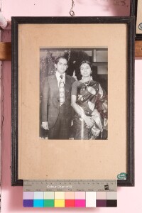 Contains 1 framed print of indoor portrait. Indoor couple portrait, three forth-length shot image of a man wearing blazer suit, with tie, standing beside a woman wearing silk saree, adorned with jewels and flowers, both facing the camera. There is a shelf at the back. Jenith studio Coonoor is printed on the mount.