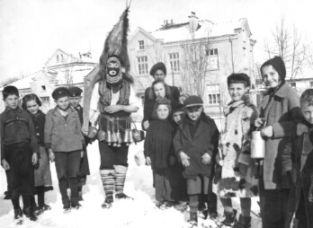 Description: mummer and children from Pavel bania, Kazanlk district (Central Bulgaria), from the Old photo-archive of NEM. Date(s): Early 20th…