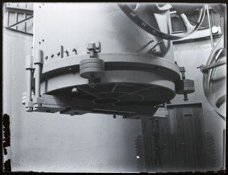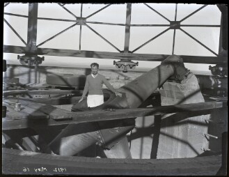 The partially completed mount of the 60-inch telescope, seen from the west-northwest looking down into the telescope pit. The polar axis is in…
