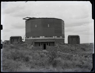 Construction site of the 60-inch building, seen from the west-northwest. The circular wall of the turret is complete and the roof is starting to be…