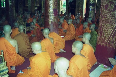 Lay people were sitting to listen monk chanting Ouposot ( observing of 227 precepts) at Vat Saen Sukharam, head by Pha Khamchan Virachitta Maha…