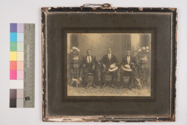 Studio portrait. Biological deterioration on the top. Sepia tone. Full length shot. Group portrait. 3 men sitting on a chair. They are wearing coat…