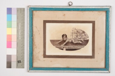 Studio portrait. Sepia tone. Framed full length shot. Oval shaped print on the mount. Portrait of naked baby laid on a table. The baby in crawling…