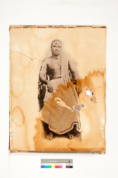 Studio portrait. Half length shot. Hand coloured image. Portrait of a woman. She is wearing saree, chain, necklace, nose studds and the customary…