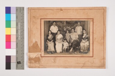 Studio portrait. Full length shot. Family portrait. Slightly deteriorated. There are 3 men, 3 women and two children. 3 women and a man are sitting…