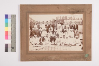 Outdoor portrait. Full length shot. Group portrait. There are 32 men and a child present in the image. Some are sitting and some are standing…