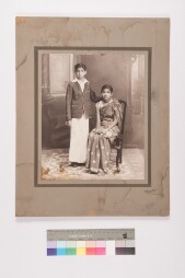 Studio portrait. Slightly deteriorated image. Young couple portrait. Girl is istting on the chair wearing saree,necklace,chain,bangles(valayal),…