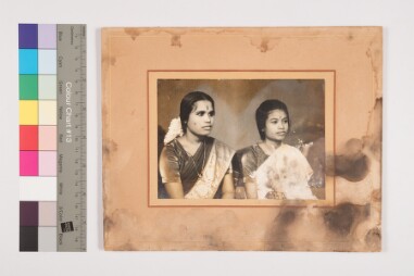 Studio portrait. Slight deterioration. There are two ladies sitting facing towards the left side wearing saree,chain with pendant,jasmine flower(…