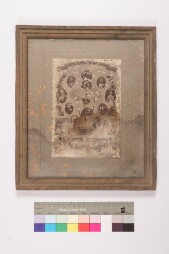 Stained grey mount. Stamp sized photos of the Western Royal family members, and images of Indians are printed in an oval shaped order, with…