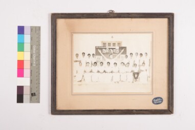 Outdoor group portrait, full-length shot image of 10 men sitting in the front row, 9 men standing at the back, on the either sides of a cinema…