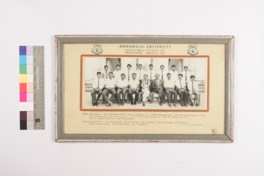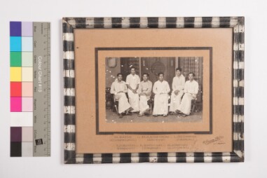 Mildly deteriorated print. Studio group portrait, full-length shot image of 6 men wearing shirt and veshti, sitting on chair, next to one another,…