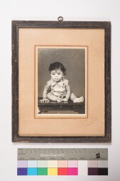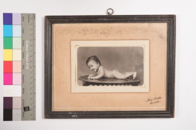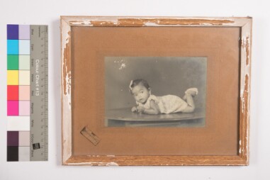 Mildly deteriorated print. Studio solo portrait, full-length shot image of a girl baby wearing frock, lying on a round wooden table, facing the…