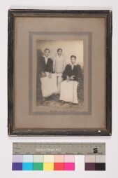 Mildly deteriorated print. Studio group portrait, full-length shot image of 3 men wearing shirt and veshti, sitting beside each other, facing the…
