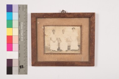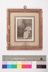 Stained mount. Mildly deteriorated print. Studio couple portrait, full-length shot image of a man wearing shirt, veshti and a stole (angavastiram…
