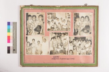 Photo montage of 6 images pasted on the same mount. All the images are indoor group portraits of an event with a small boy and a small girl,…