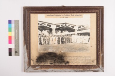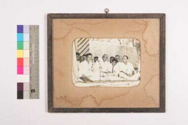 Stained mount. Outdoor group portrait, full-length shot image of a Kamarajar, TamilNadu Cngree leader, who is a bald man sitting second from the…