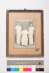 Mildly deteriorated print. Studio group portrait, full-length shot image of an aged man sitting in the middle, and 2 men standing beside him, all…
