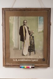 Studio group portrait, full-length shot image of an aged man sitting in the middle, and 2 men standing beside him, all wearing shirt and veshti, facing the camera