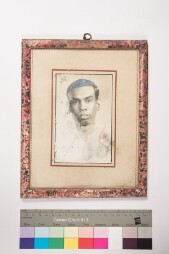 Deteriorated print. Studio solo portra8it, bust shot image of a man, wearing shirt, facing the camera.