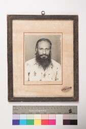 Mildly deteriorated print. Studio solo portrait, bust shot iamge of aman wearing shirt, with beard and moustache, facing the camera. Plain…