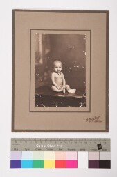 Grey mount. Mildly deteriorated print. Studio solo portrait, full-length shot image of a naked baby wearig chaien with a customary symbol on the…
