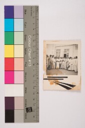 Stained mount. Outdoor group portrait, full-length shot image of more than 50 men sitting and standing in 5 rows, 6 women sitting on the floor,…