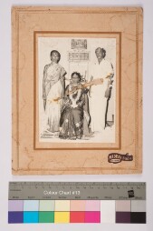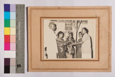 Stained mount. Mildly deteriorated print. Indoor group portrait, full-length shot image of a women in silk saree, adorned with jewels and garland,…