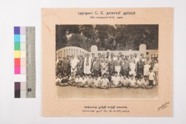 Indoor group portrait, full-length shot image of T.N.Ramalinga Ayyar's 60th anniversary celebration. Photo taken at Sri Presanna, Venketesa…