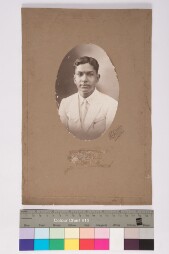 Grey mount. Mildly deteriorated oval shaped, vignetted, print. Studio solo portrait, bust shot image of a man wearing blazer, tie and with a…