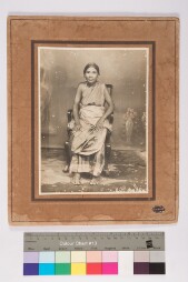 Stained mount. Mildly deteriorated print. Studio solo portrait, full-length shot image of an old widow, wearing silk saree, chain, bangles, rings,…