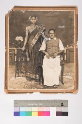 Stained and torn mount mount. Mildly deteriorated print. Studio, couple portrait, full-length shot image of a man wearing shirt, veshti and coat,…