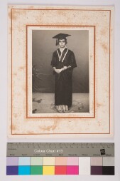 Stained mount. Studio solo portrait, full-length shot image of a woman wearing saree, graduation robe and hat, spectacles, flowers, holding a…