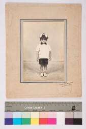 Stained mount, studio solo portrait, full-length shot image of boy toddler, wearing shirt and trousers, hat, shoes and socks, standing, facing the…
