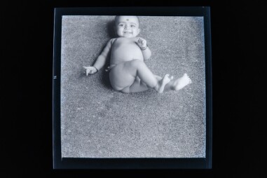 Image of a naked baby lying on the floor at the back