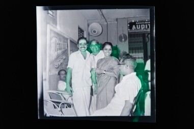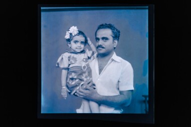 Studio portrait. Half length shot. Deteriorated image. Image of a man standing carrying a small girl in his right waist. The man is wearing shirt,…