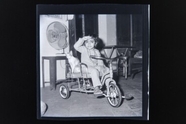 Image of a small girl sitting on the baby cycle wearing shirt,pant and neck chains