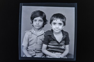 Studio portrait. There are 3 images in the 35mm roll. Portrait of a girl and a boy sitting and smiling at the camera. The background is plain.…