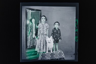 Studio portrait. Pink washed image. Image of 2 children standing on a wooden stool wearing skirt and blouse(pavadasattai),shirt and trouser. A dog…