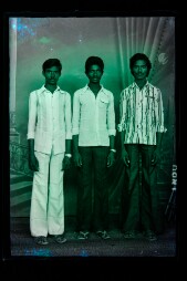 Pink washed image. Studio group portrait, full-length shot image of 2 women in saree, adorned with jewels and flowers, one man in shirt an dpants…
