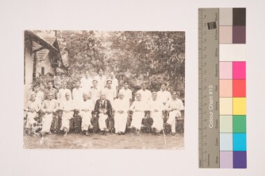 Outdoor portrait. Biological deterioration. Group portrait. There are 25 men in the image. Sitting and standing wearing shirt,jippa and veshti. Man…