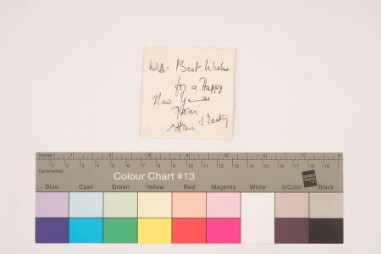 Portrait of the backside of the previous image that has a signature with date