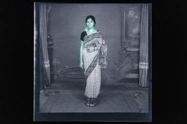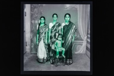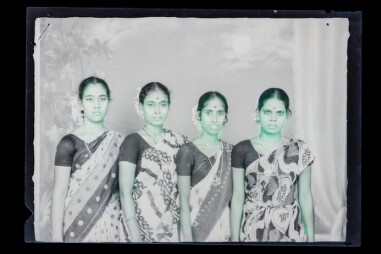 Studio portrait. Pink washed image. Full length shot. Three ladies are standing with a baby sitting in the front. Ladies are standing wearing saree…