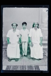 Studio portrait. Pink wash. Full length shot. Two men and one boy is standing in middle. Wearing shirt,towel(tundu),veshti and pant. Background has…