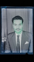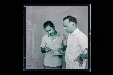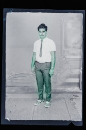 Biologically damaged negative. Studio solo portrait, bust shot, pink washed image of a man without moustache, wearing shirt and facing the camera.…