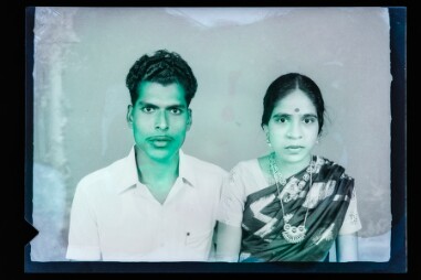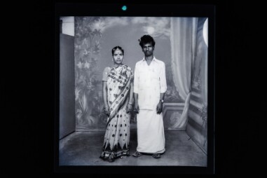 Studio portrait. Pink washed image. Half length shot. Couple portrait. Husband and wife are sitting wearing shirt, saree, chain with a big pendant,…
