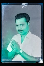 Studio portrait. Recopy of a image. Slightly deteriorated. Pink washed image. A man is sitting facing rigth side, keeping his hands in praying…